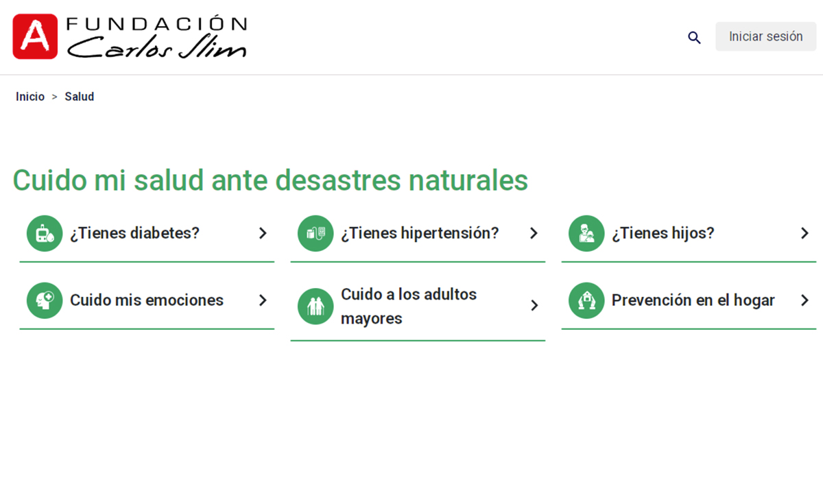 Ante ello, Fundación Carlos Slim (FCS), mediante la sección Salud de su plataforma Aprende.org, ofrece al público en general el apartado “Cuido mi salud ante desastres naturales”, en donde las personas pueden consultar información avalada por médicos y científicos sobre todo lo relativo a desastres naturales, así como las medidas que deben seguir para afrontarlos y prevenir/manejar problemas de salud relacionados.