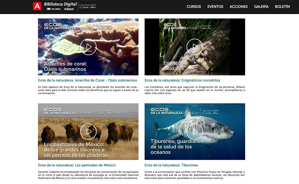 Fundación Carlos Slim invita al público en general a visitar la sección “Galería (Biblioteca Digital)” de su plataforma Pabellón Nacional de la Biodiversidad, en donde es posible acceder a una serie de contenidos que nos presentan un panorama general sobre este espacio dedicado a la divulgación del conocimiento científico, el aprendizaje, la investigación y la conservación de la biodiversidad de México. Además, gracias a estos materiales, expertos detallan la importancia del Pabellón Nacional de la Biodiversidad, de sus colecciones y del gran significado del concepto de biodiversidad.