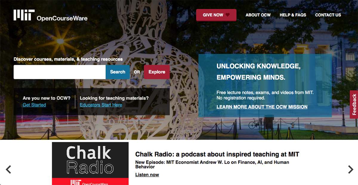 MIT OpenCourseWare continúa construyendo sobre dicha base. Con una nueva plataforma web, contenido en constante crecimiento y colaboraciones en el vibrante ecosistema de educación abierta, ha sido posible un mundo de educación más equitativa e inclusiva para todos.