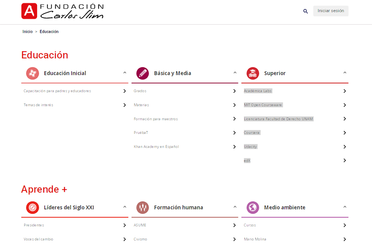 La plataforma Aprende.org de Fundación Carlos Slim ofrece el apartado Educación en su sección del mismo nombre, gracias al cual los usuarios pueden adquirir conocimientos sobre educación inicial, básica, media y superior