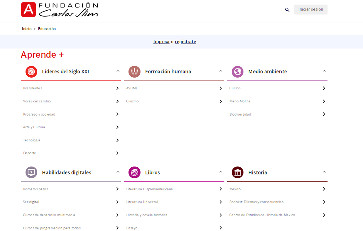 Aprende.org, plataforma de aprendizaje diseñada por Fundación Carlos Slim, ofrece contenidos educativos de calidad mundial en diferentes áreas del conocimiento. Su contenido se divide en 5 ejes principales: Pabellón Nacional de la Biodiversidad, Museo Soumaya, Educación y cultura, Capacítate para el Empleo y Salud.