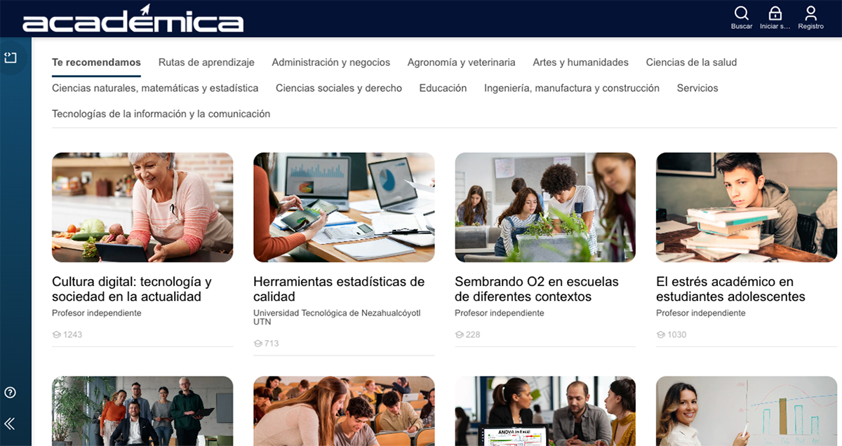 Concretamente, la plataforma brinda una oferta educativa que incluye rutas de aprendizaje y cursos especializados, la cual se divide en ls siguientes categorías: