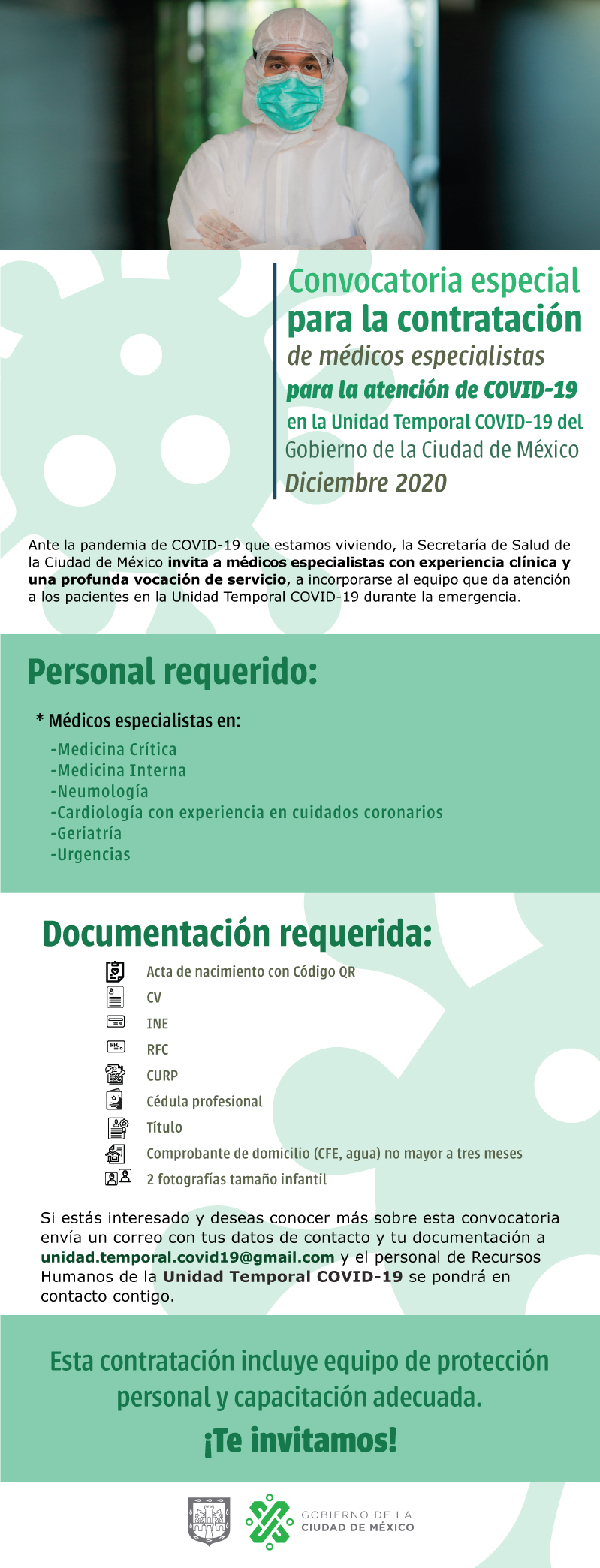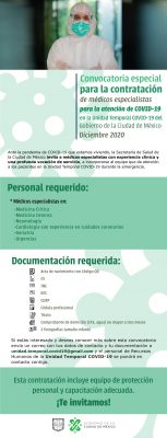 Publicado el 11 de diciembre de 2020 a las 5:34 pm. 🔊 Escucha el artículo convocatoria-medicos-especialistas-diciembre-2020 TE PUEDE INTERESAR Fundación Carlos Slim y el Instituto Broad del MIT y Harvard fortalecen cooperación en medicina genómica Accede al apartado Abogados con costo de la plataforma AccesoLatino.org Cápsula La Puerta del Infierno | El viaje en Museo Soumaya