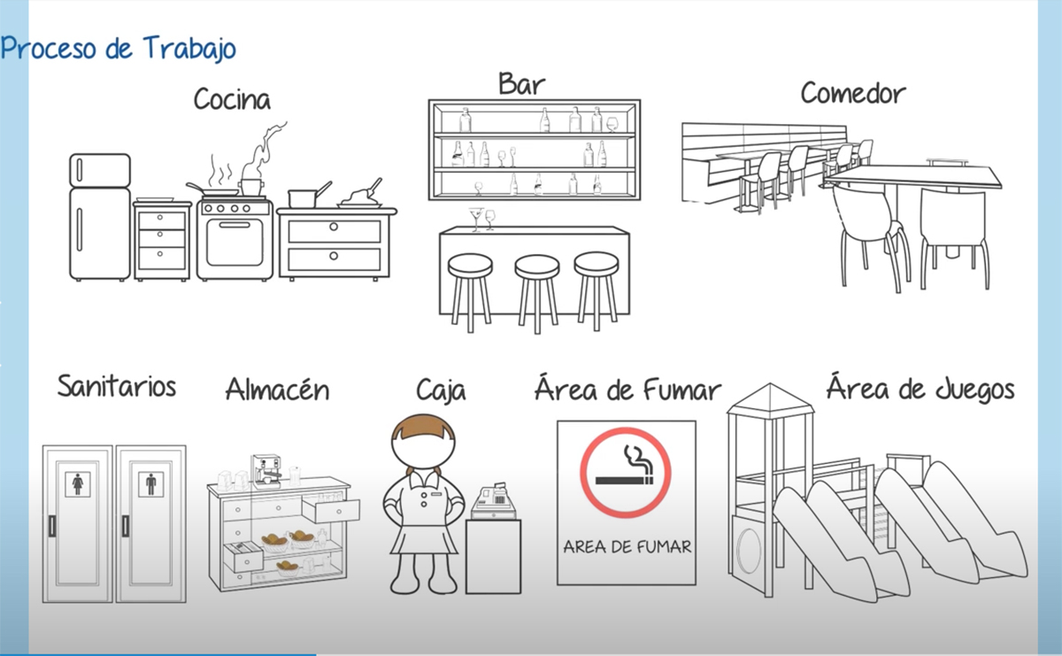 - Identificar las áreas que conforman a un restaurante, como cocina, bar y comedor; así como los servicios generales que incluyen sanitarios, almacén, recepción y caja. En algunos establecimientos, también hay áreas de fumar y áreas de juegos.