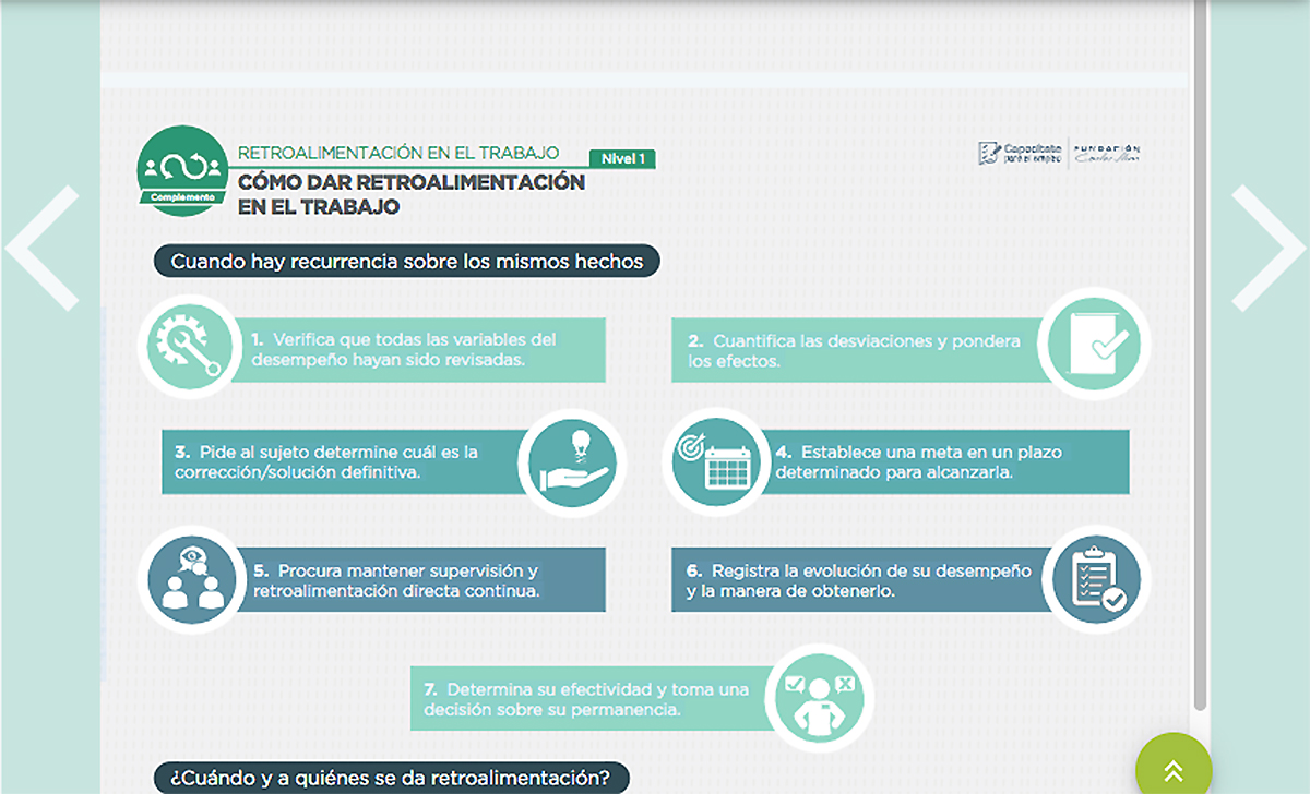 Ante ello y para promover el aprendizaje y adquisición de habilidades/conocimientos entre la población, Fundación Carlos Slim, mediante su plataforma Capacítate para empleo, ofrece el curso complementario “Retroalimentación en el trabajo”, cuyo objetivo es que los participantes aprendan a dar una retroalimentación adecuada y productiva en el trabajo, guiada por una comunicación basada en el respeto.