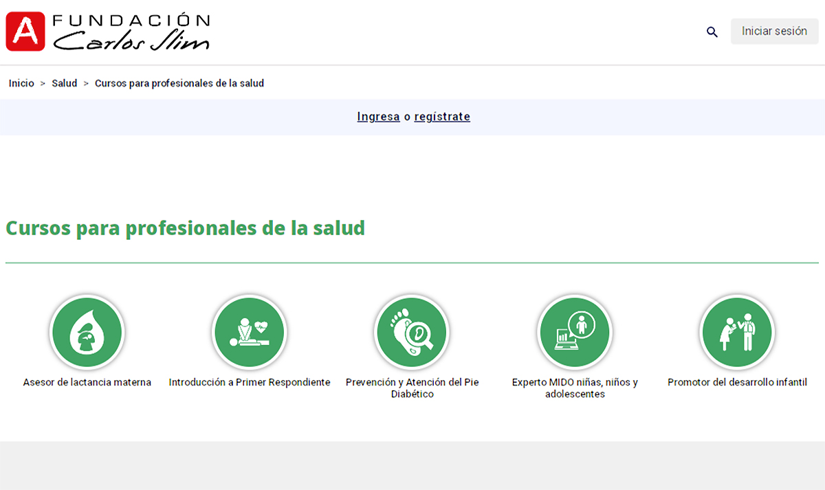 Para promover estilos de vida saludables entre la población y brindar información respaldada científicamente sobre temas de salud, Fundación Carlos Slim, mediante la sección Salud de su plataforma Aprende.org, ofrece el apartado “Cursos para profesionales de la salud” donde es posible acceder a cursos en línea centrados en asesoría, prevención y promoción de la salud en diversos rubros, los cuales fueron diseñados específicamente para personal de salud en general.
