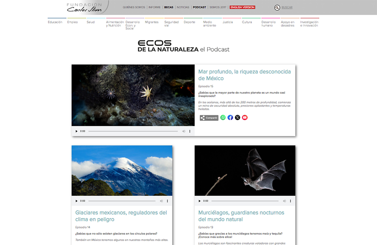 Para mantener su compromiso de preservar un medio ambiente saludable, reducir los riesgos del cambio climático y la pérdida de biodiversidad en México, Fundación Carlos Slim pone al alcance de todos Ecos de la Naturaleza | El Podcast, una serie de podcasts donde reconocidos especialistas hablan sobre la extraordinaria riqueza natural que albergan los ecosistemas distribuidos a lo largo y ancho de nuestro país, así como de las acciones que realizan organizaciones de la sociedad civil y académicas para conservar y restaurar los ecosistemas y las especies silvestres mexicanas.